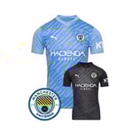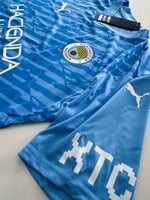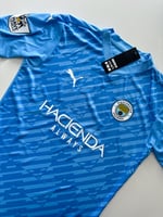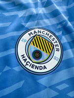 Hacienda sponsor in hi build vinyl across the chest and XTC printed arm sponsor. The badge will be printed in ultra quality print to retain sharpness and colour accuracy.