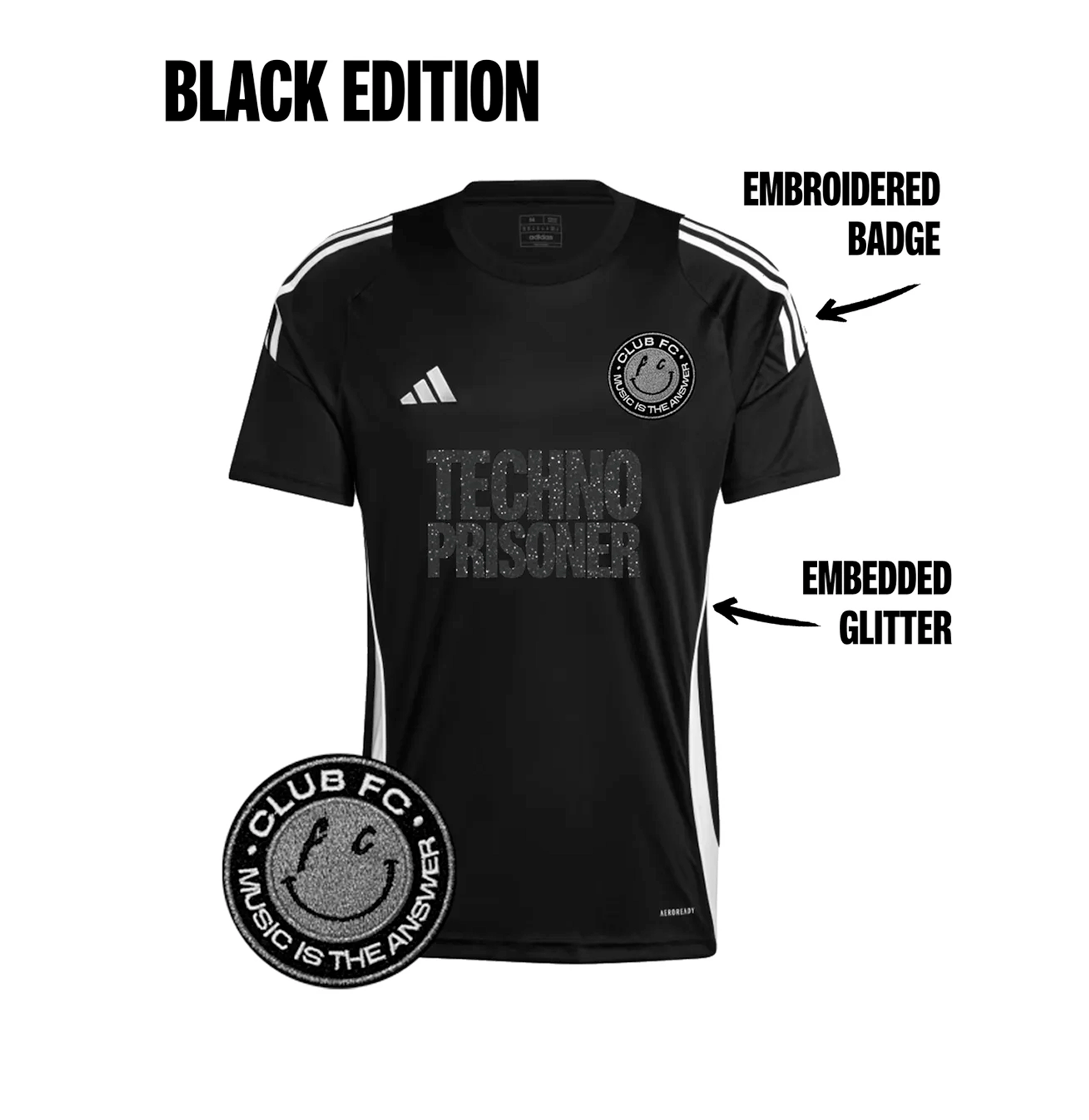 The Club FC 'Techno Prisoner' jersey. With our striking metallic embroidered team badge and stealthy black glitter chest sponsor, this jersey will stand out from a crowd in the daytime and under the club lights. Printed on an official Adidas AEROREADY jersey. AEROREADY absorbs sweat to cool you down so you can focus on that next DJ's set.