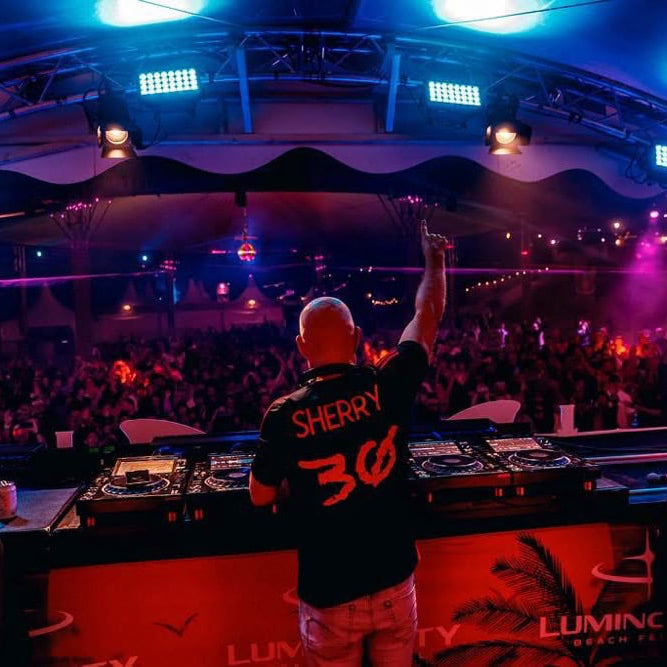 Released in honour of his latest album “Thirty” on Outburst Records, this shirt fuses clubwear attitude with football culture a nod to Sherry’s relentless energy, underground roots, and global influence in electronic music.