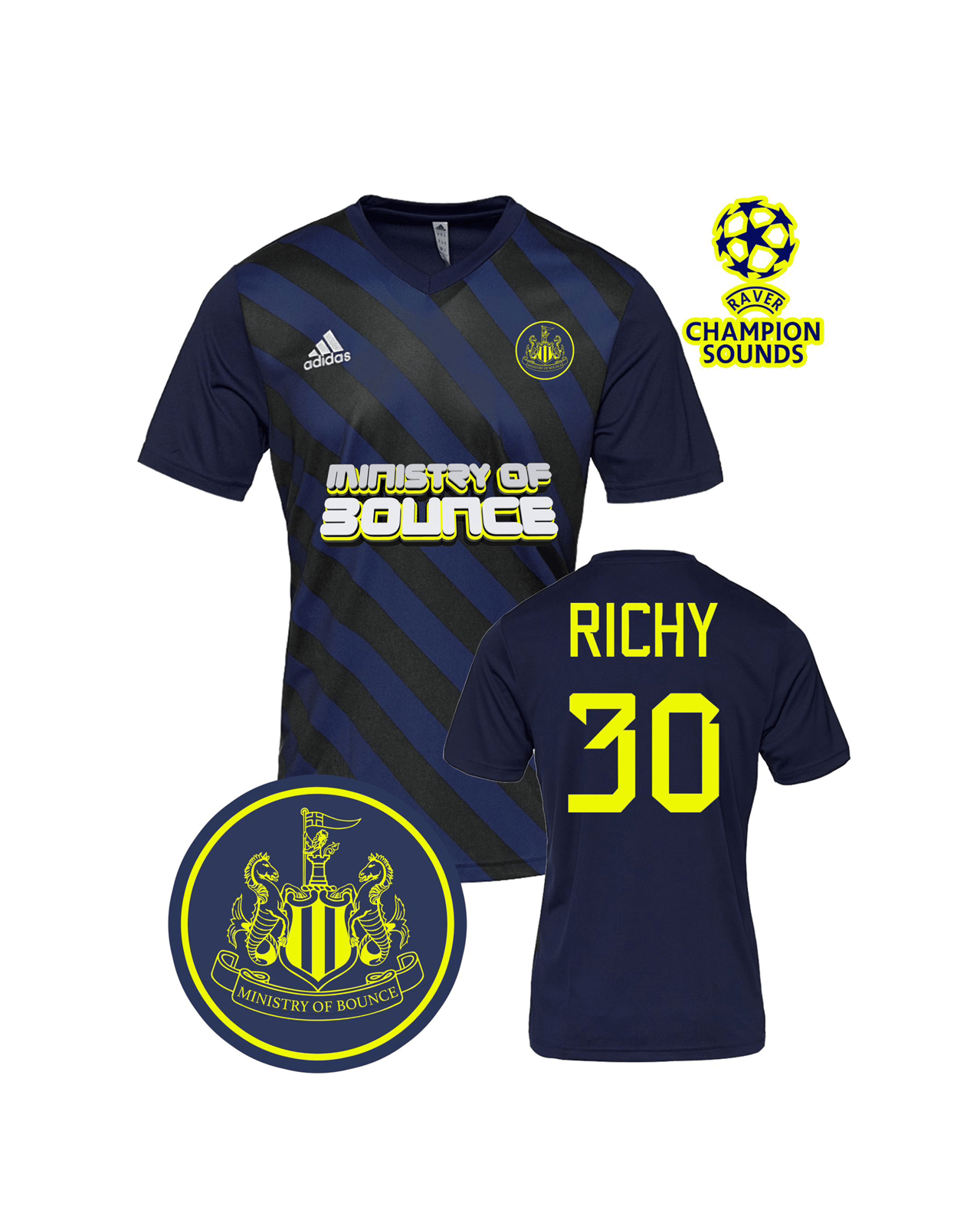 Raver Champions sounds logo on the arm and customised with a name/number of your choice.