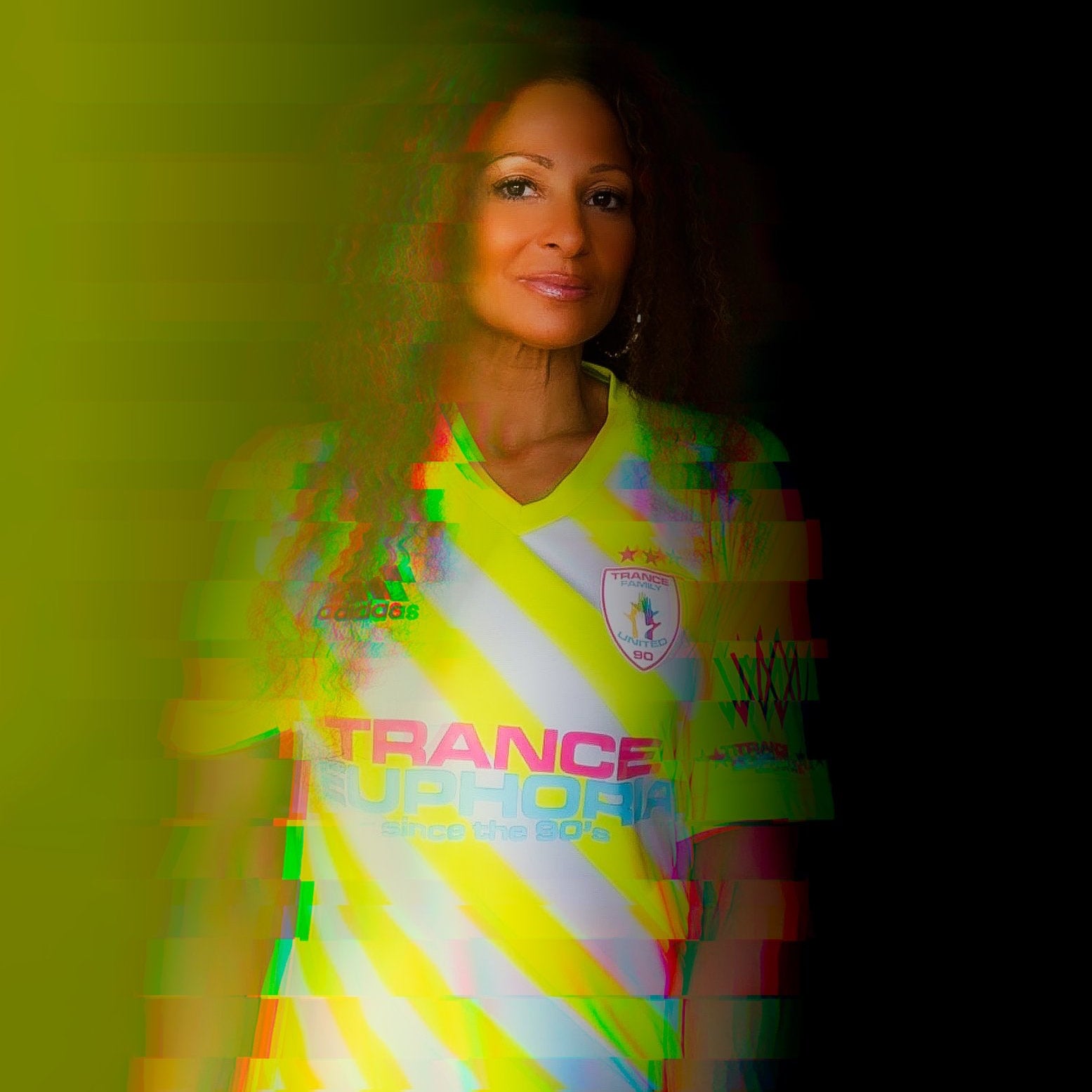 Trance Family UTD. Who doesnt like euphoric trance from the 90's?!! Genuine Adidas Aeroready jersey to wick away the moisture whilst you throw out shapes to the classics of the past. This is one of my personal favourites due to the bright colours and striking pattern. Printed in high quality print to ensure colour accuracy. An absolutely belting jersey. *The photo show Marcella Woods rear of the jersey but you can choose your own name or have it blank. Just let us know when you buy by leaving a note*.
